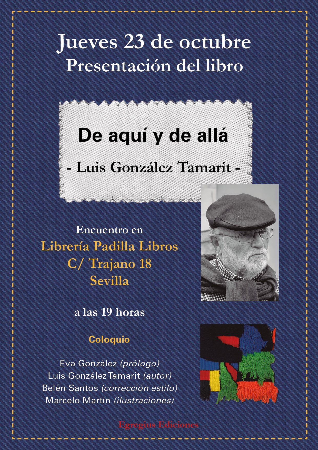 El próximo día 23 de octubre, a las 19h, presentaremos el último libro de Luis González Tamarit, De aquí y de allá. Habrá un coloquio donde participará el autor junto con la prologuista, Eva González Lezcano, Belén Santos y el ilustrador de la obra, Marcelo Martín.